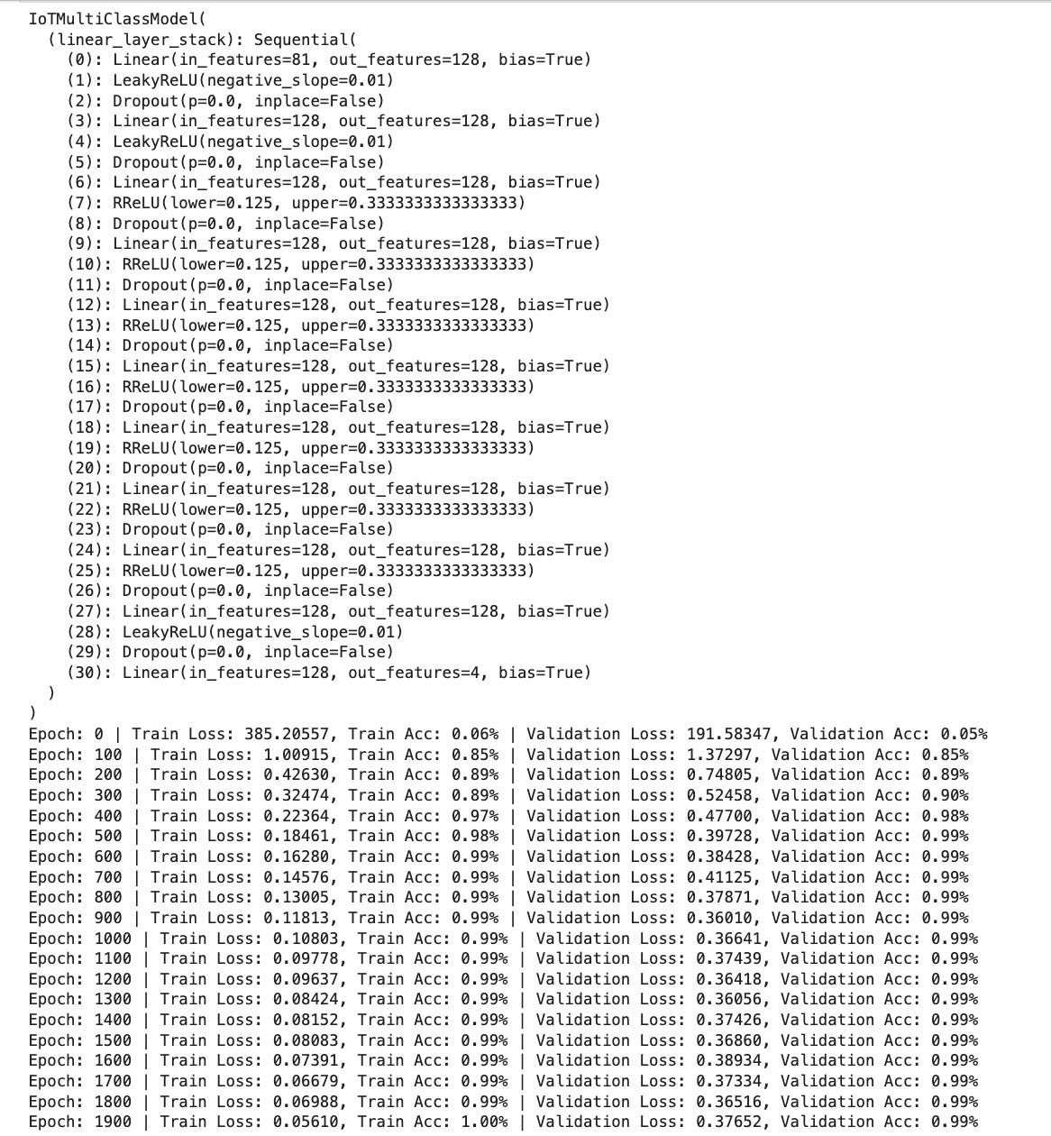 Example output from the training loop. Printing the model object, will display the model architecture.