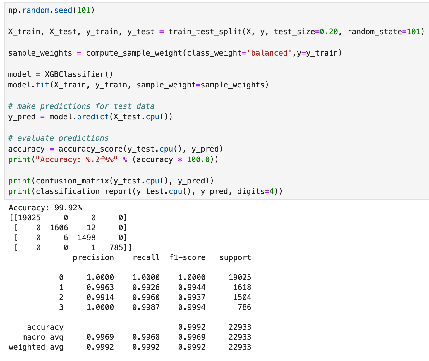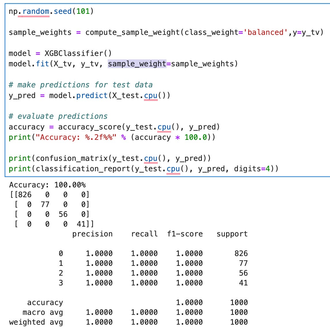Next, we can load the XGBClassifier and fit the training data with the sample weights. XGBoost has different options to help deal with imbalanced classes. For our case, we will use the sample_weight parameter in the fit method. The sample_weight parameter allows us to specify a different weight for each training sample, whereas the scale_pos_weight parameter in the XGBClassifer method lets us provide a weight for an entire class in the samples.