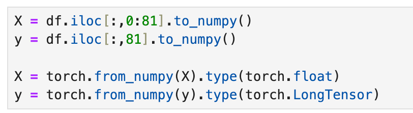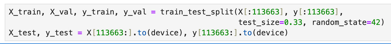 Before training the model, we need to do a bit of setup by converting the data to pytorch tensors, then split the data into train, validation, and test sets.