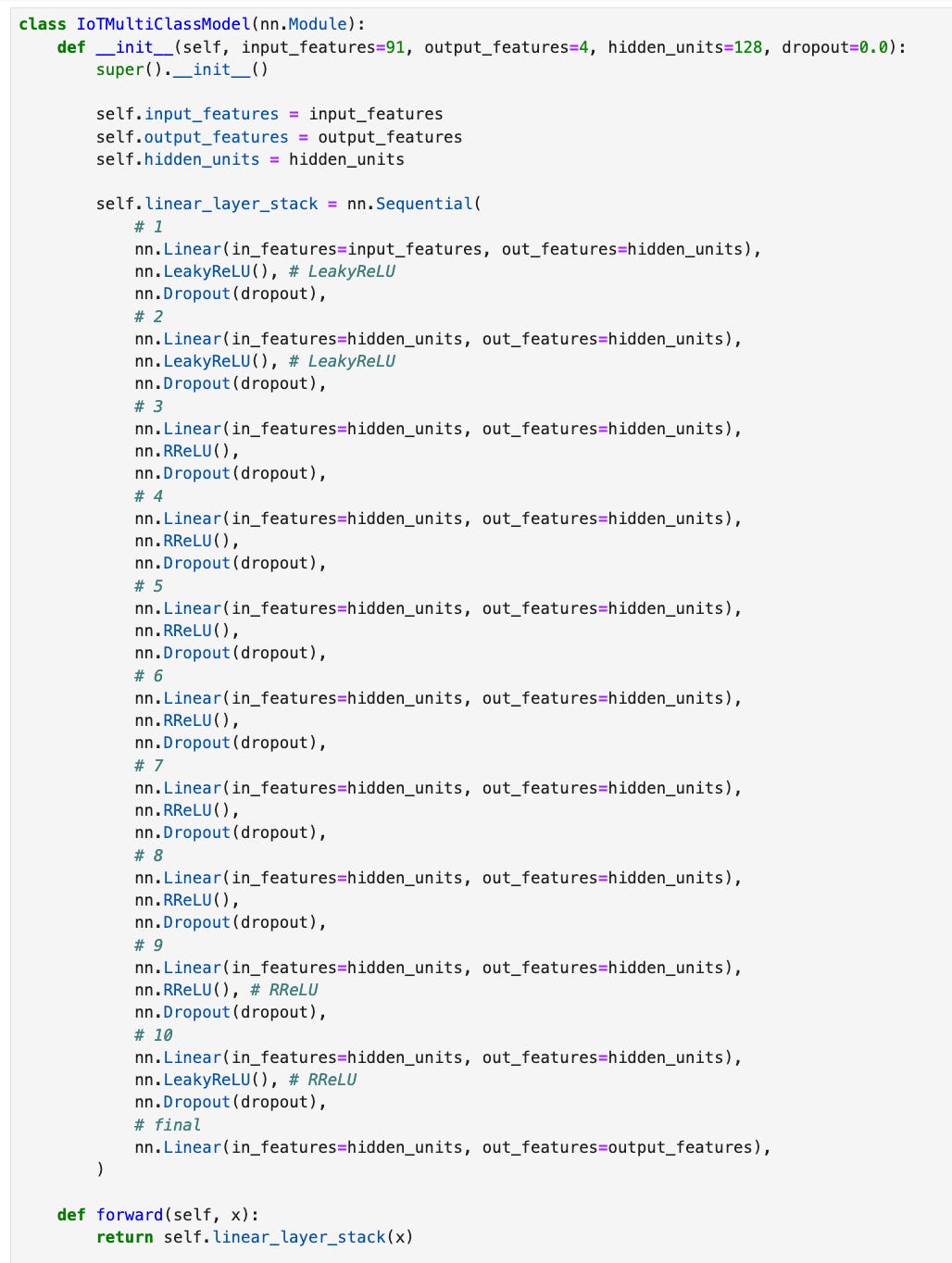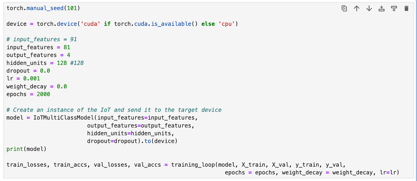 As with previous posts, we’ll use PyTorch to build our model. Since we are trying to distinguish between adversarial network behaviors, we will need to build a multiclass classifier that can detect valid traffic, such as MQTT and Thing Speak traffic, and malicious network traffic, such as denial of service and ARP poisoning attacks.