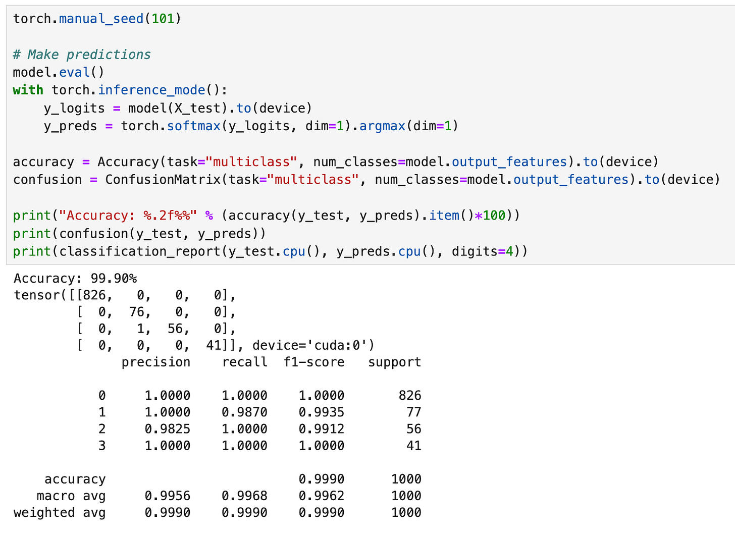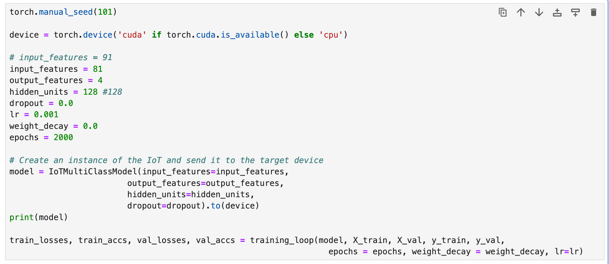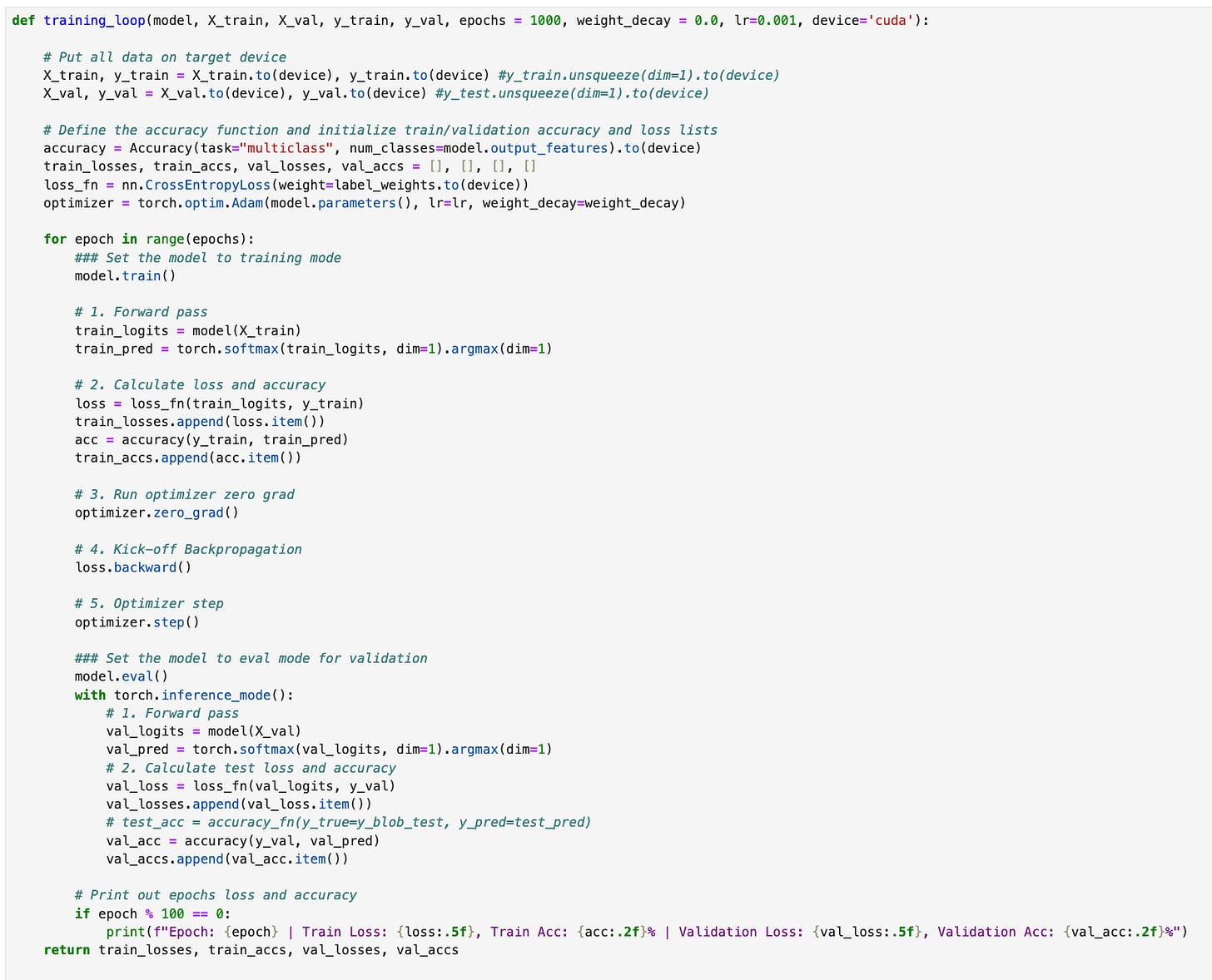 The training loop used with this model is shown below. It takes the training and validation data and places it on the specified device (cpu or gpu). We will use the torchmetrics accuracy function to calculate the accuracy at each epoch. CrossEntropyLoss is used because this is a multiclass classification problem and we will use the Adam optimizer.