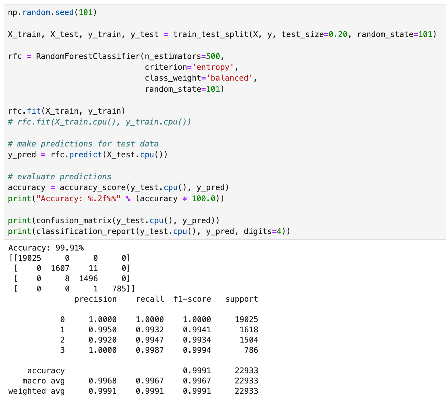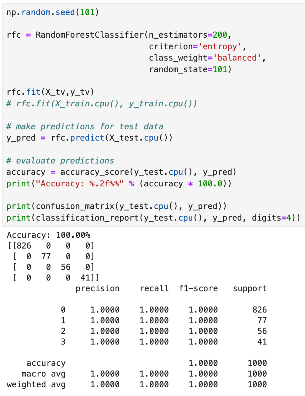 Checking the accuracy and confusion matrix for the test predictions shows that we were able to classify all the test samples correctly; this is pretty amazing for an “out-of-the-box” model! Next let’s see if we do the same thing with good old Random Forest.