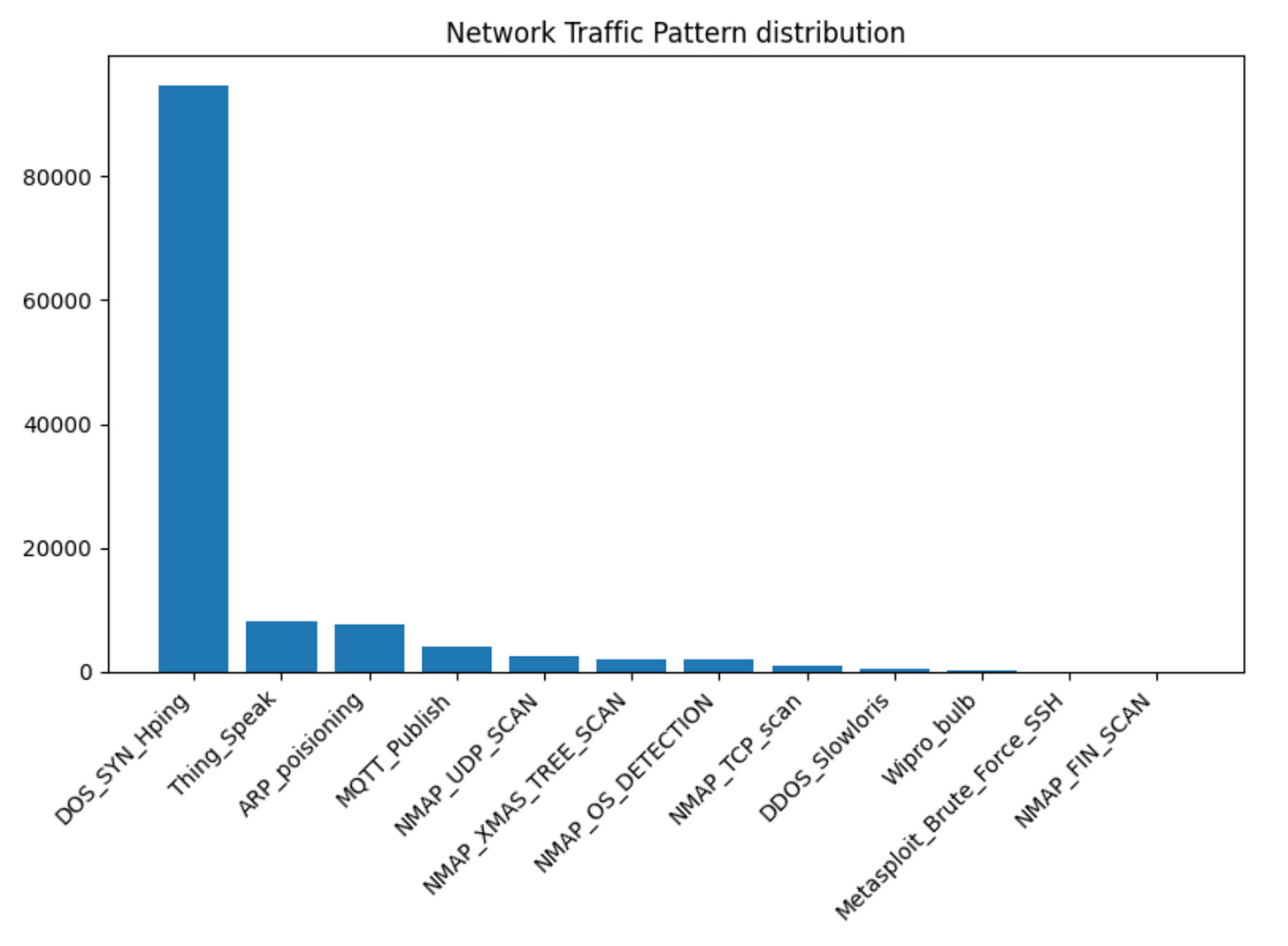 When we plot the label distribution, it's clear that the dataset is heavily skewed toward the "DOS_SYN_Hping" data points. This means the dataset is imbalanced, and we will have to deal with that when we train our models.