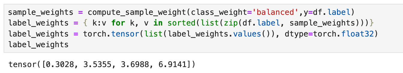 How do these sample weights help us deal with imbalances in our data? In our PyTorch classification model, we will use CrossEntropyLoss as our loss function. If we look at the CrossEntropyLoss documentation, there is an option to pass the function a weight tensor that serves as "a manual rescaling weight given to each class." We use the weights calculated below with our cross-entropy loss function.